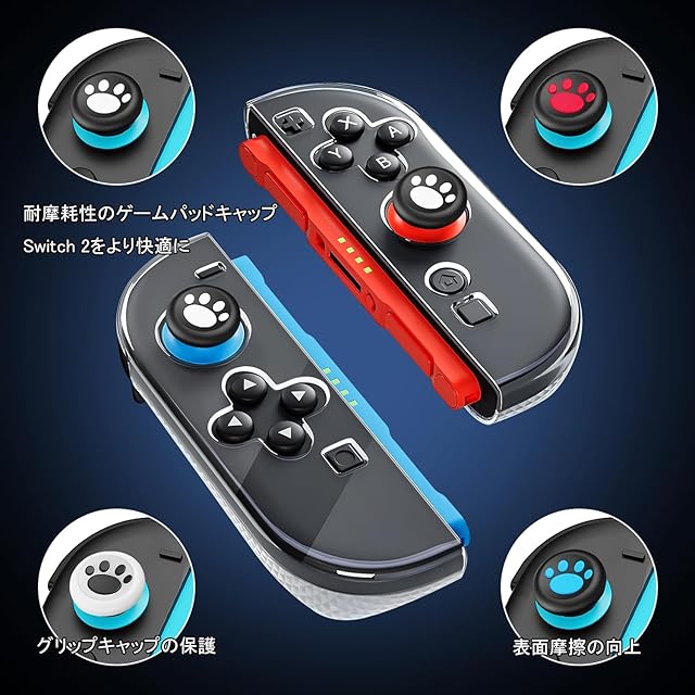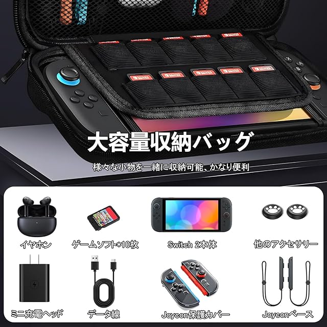 【Switch 2用アクセサリー収納ケース】Switch 2の収納ケースは、どこにでも持ち運び可能で、通常の製品よりも大容量です。パッケージには、Switch 2専用の収納ケース(1個)、9H強化ガラスフィルム(2枚)、分体式PC保護カバー(1個)TPU グリップケース(2個)、親指キャップ(8枚)。これ一つで、大切なデバイスをしっかり保護し、快適にプレイできます。
