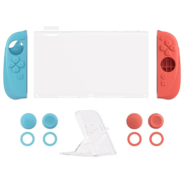 【充実の保護アクセサリーセット】シリコングリップ(左右)×2、PCバックカバー×1、多角度スタンド×1、サムスティックキャップ(凹型×2、凸型×2)付き。※Switch本体およびJoy-Conは付属しません。