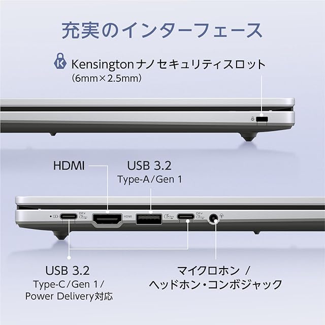 【USBポート】USB3.2 (Type-C/Gen1/Power Delivery対応) ※データ転送と映像出力、本機への給電をサポート×2、USB3.2 (Type-A/Gen1) ×1【ディスプレイ出力】HDMI×1、Type-C×2【オーディオ】ステレオスピーカー内蔵 (2W×2)、アレイマイク内蔵、マイクロホン/ヘッドホン・コンボジャック×1【通信機能】無線:IEEE802.11a/b/g/n/ac/ax (Wi-Fi 6), Bluetooth 5.3