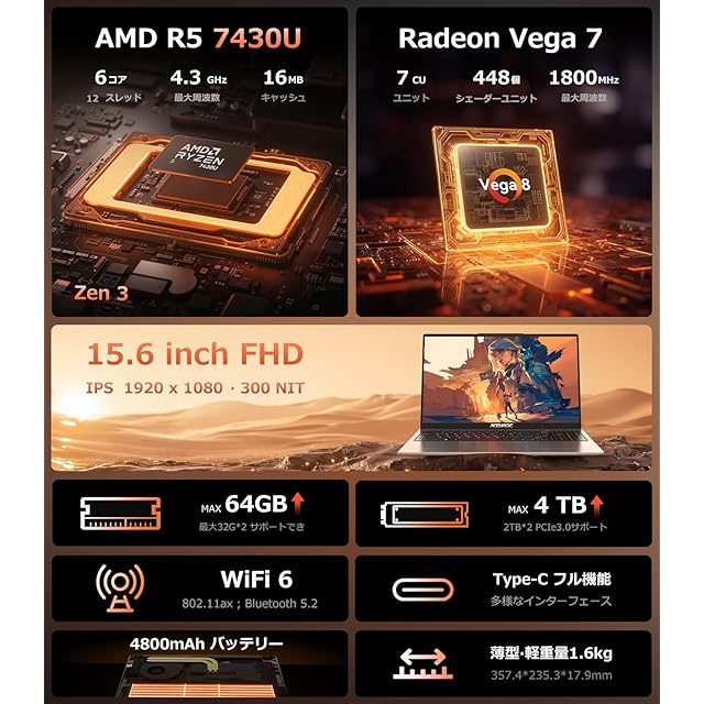1.【革新的なZen 3 7430Uで効率的な作業が軽快に】この7430Uノートパソコンは、新しいZen 3アーキテクチャを採用し。これは1コアあたりの処理能力(IPC)が前世代より約19%向上し。ターボ周波数が最大4.3GHzまで達し、6コア12スレッドで動作し、7520Uの4コアより生産性タスクで平均40%圧倒。又は16MB L3キャッシュがブラウザ応答速度を最大50%向上、素早く応答速度の速さをもたらし。