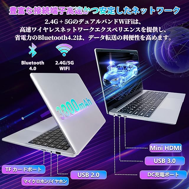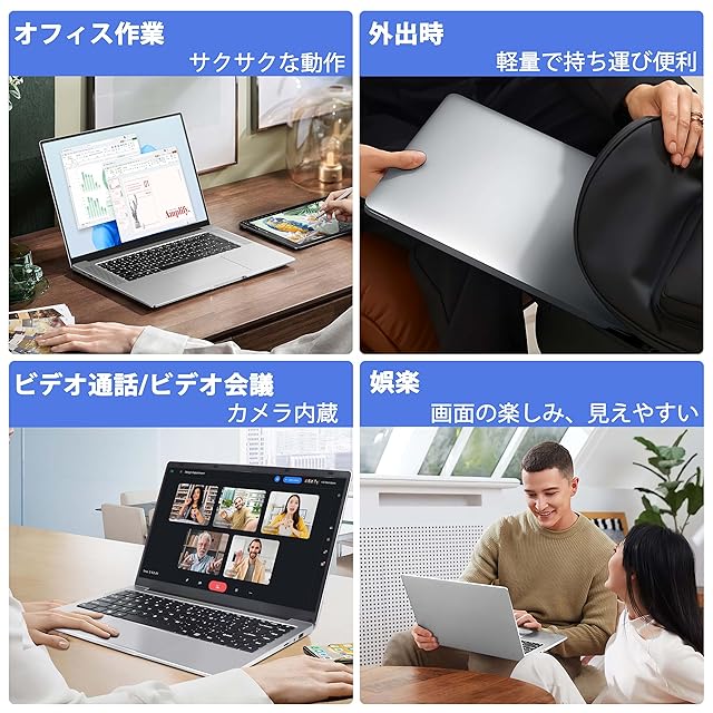【心地良よい使用感】薄くて持ち運びに便利です。手に取ってご覧ください。 高級感のあるつや消し触感で、驚くほど快適な着心地を実現。さまざまな実用的な機能を備えており、日常の利便性を向上させます。まず、多様なインターフェースを備えており、さまざまな機器との接続が可能です。USBポート、HDMIポート、イーサネットポートなどが装備されており、外部ディスプレイや周辺機器との接続がスムーズに行えます。さらに、日本語キーボードカバーが付属しており、日本語入力にも対応しています。スムーズなタイピングを実現します。また、マウスもセットで提供され、パソコンの操作性を向上させます。 図書館で勉強したり、カフェで仕事をしたりするのにも便利です。家庭でのエンターテイメントや仕事での生産性向上など、幅広いシーンで活躍します。そのため、このパソコンは実用性が高く、日常の生活に便利なパートナーとなるでしょう。