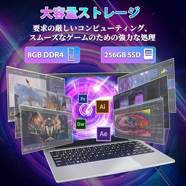 【超メモリ】効率的なマルチタスクやデータ処理をサポートします。8GBのDDR4メモリは、複数のアプリケーションの同時起動やウェブブラウジング、文書作成などの日常的なタスクを快適にこなすことができます。メモリの高速なデータ転送速度により、アプリケーションの読み込み時間が短縮され、作業効率が向上します。また、256GBのSSDは大容量のデータの保存や高速なファイルアクセスを可能にし、ストレージのパフォーマンスを向上させます。このパソコンは、日常のコンピューティングニーズに十分対応し、快適な使用体験を提供します。また、256GBのSSDは高速なデータ転送と起動時間の短縮を実現し、効率的な作業環境を提供します。コンパクトでありながら高性能で、日常のニーズに応える優れた選択肢です。