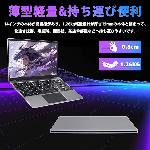 【心地良よい使用感】薄くて持ち運びに便利です。手に取ってご覧ください。 高級感のあるつや消し触感で、驚くほど快適な着心地を実現。さまざまな実用的な機能を備えており、日常の利便性を向上させます。まず、多様なインターフェースを備えており、さまざまな機器との接続が可能です。USBポート、HDMIポート、イーサネットポートなどが装備されており、外部ディスプレイや周辺機器との接続がスムーズに行えます。さらに、日本語キーボードカバーが付属しており、日本語入力にも対応しています。スムーズなタイピングを実現します。また、マウスもセットで提供され、パソコンの操作性を向上させます。 図書館で勉強したり、カフェで仕事をしたりするのにも便利です。家庭でのエンターテイメントや仕事での生産性向上など、幅広いシーンで活躍します。そのため、このパソコンは実用性が高く、日常の生活に便利なパートナーとなるでしょう。