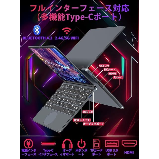 【強化された接続性とHDカメラ&多機能タッチパッド】デュアル周波数WiFi(2.4 G/5 G)とBluetooth 4.2で接続を維持し、迅速で信頼性の高い接続を実現します。ラップトップには30 fpsの200万画素ハイビジョンカメラが搭載されており、鮮明なビデオ通話に最適です。USB 3.0ポート、Type-Cポート、ミニHDMI、DC電源、オーディオジャックを備え、自宅でも外出先でも、シームレスな接続に必要なポートはすべて揃っています。ユニークな楕円形タッチパッドはナビゲーションを超えており、簡単なジェスチャーで音量や画面の明るさをコントロールでき、ワークフローをよりスムーズかつ直感的にすることができます。