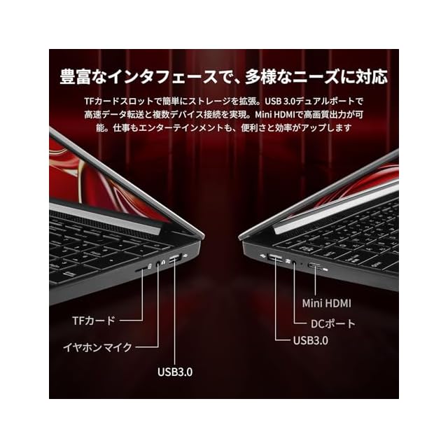 【多機能搭載ノートpc 軽量】指紋認証付き(0.3秒で素早くロークを解除)/フィルム付き/⌨テンキー付き/⌨✨バックライト付き 【豊富な接続端子】DCポート、USB 3.0ポートx2、mini HDMI、イヤホンジャック、TFカードスロットが装備されて、さまざまなデバイスや周辺機器との接続が簡単に行え、データの転送や画面共有もスムーズに実現します。
