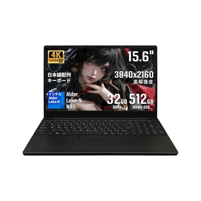《新品未開封》15.6インチ 4K液晶(3840x2160)インテルN95 ノートパソコン全金属筐体 /32GB DDR4 高速NVMe SSD/指紋認証/日本語配列キーボード付き/webカメラ付き薄型軽量ノートpc/windows 11 MS Office 2019/ ラップトップ laptop初心者向け・ZOOM・授業用・在宅勤務 (4K/N95/ブラック, 32GB+512GB)