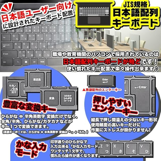 【安心の日本語配列キーボード】JIS規格・日本語配列キーボードは日本語ユーザー向けに設計されたキーボード配置です。日本の職場や教育機関のパソコンで採用されているのは日本語配列キーボードがほとんどですので、使い慣れたキー配置で楽々操作出来ます!/【快適キー操作】手に馴染むコンパクトキーボード。キーピッチ19mm、キーストローク0.8mm。広々としたタッチパッド。