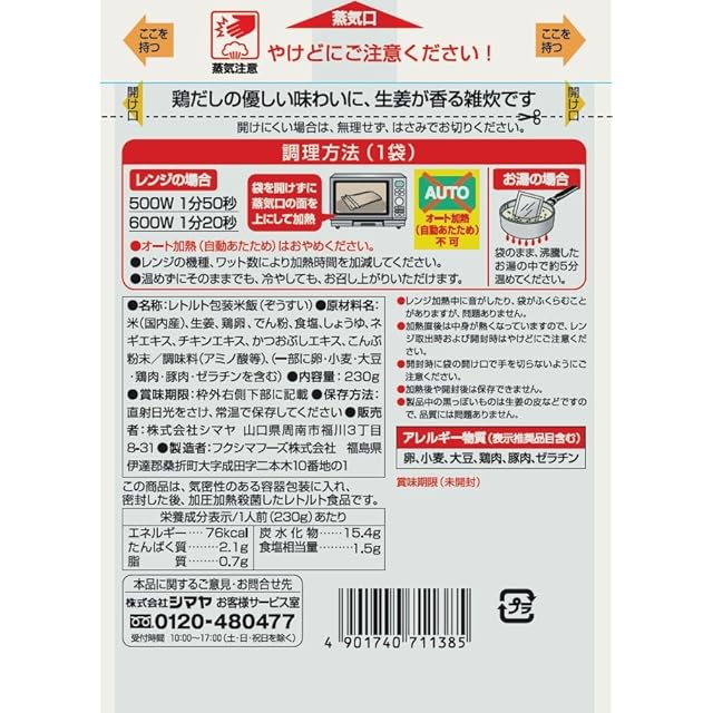 商品名:《新品未開封》シマヤ 昔ながらの雑炊 鶏だし生姜味 230g×10個