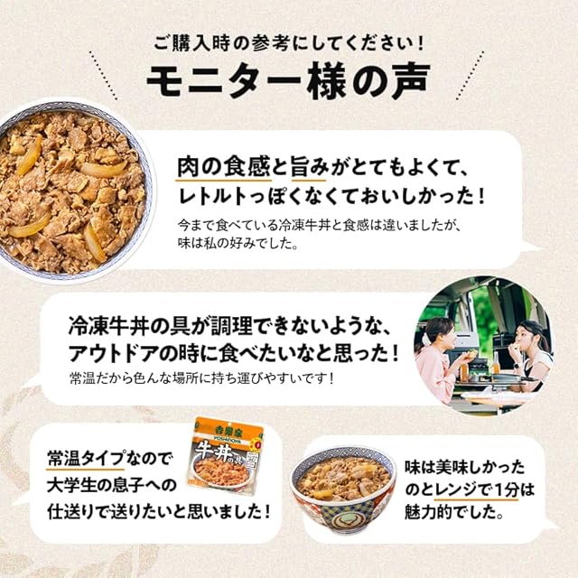 【常温保存・レトルト牛丼】冷凍庫の空きスペースがない方やクール便配達エリア外の方、冷凍牛丼の具が調理できないようなアウトドアシー ンでのご要望が多かった常温レトルト牛丼を約5年もの年月をかけて開発いたしました。