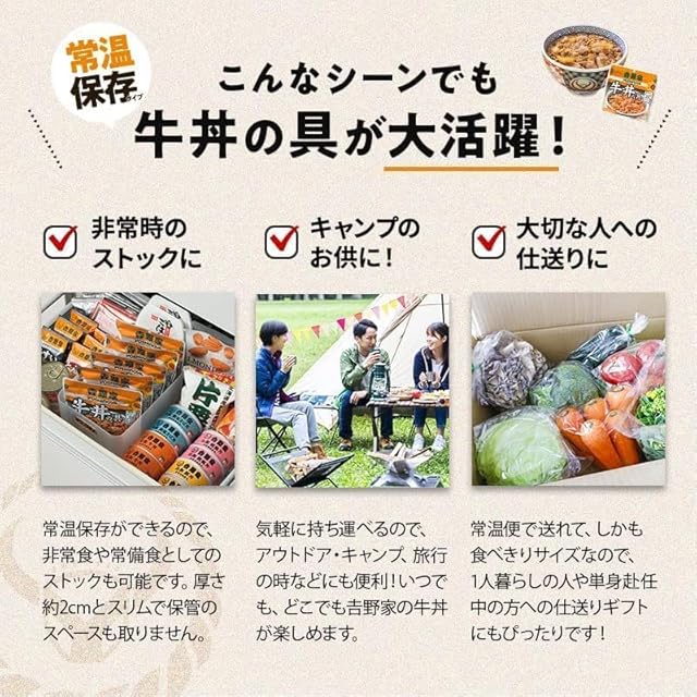 ■牛丼の具(常温保存タイプ)<br><br> 冷凍庫の空きスペースがない方やクール便配達エリア外の方、冷凍牛丼の具が調理できないようなアウトドアシーンでのご要望が多かった常温レトルト牛丼!<br> 一般的にレトルト加工は高温で加圧した調理を行うため、原料の味・食感・香り等が大きく変化しますが、吉野家ではレトルト加工前に特殊な下処理を加えることで味・食感・香りを損なわない工夫を凝らしました。 <br> 長い歴史で培った牛肉に関する知識と最新の技術を活かし、肉の食感にこだわった牛丼の具となっております。<br><br> 【原材料】牛肉加工品(国内製造)、玉ねぎ、調味液[ぶどう発酵調味料、しょう油、砂糖、しょう油加工品(しょう油、糖蜜、砂糖、その他)、その他]、粉末しょう油、砂糖、食塩、玉ねぎエキスパウダー、しょうがペースト、しょうがパウダー、にんにくパウダー/調味料(アミノ酸等)、増粘多糖類、カラメル色素、酸味料、香辛料抽出物、(一部に小麦・牛肉・ゼラチン・大豆・りんごを含む)【特製唐辛子】乾燥紅生姜〔生姜酢漬け(生姜、食塩、その他)、マルトース、ぶどう糖、食塩〕(国内製造)、陳皮、唐辛子、いりごま、青さ/酸味料、アカダイコン色素、調味料(アミノ酸等)、(一部にごまを含む)<br><br> 【アレルギー情報】小麦・牛肉・ゼラチン・大豆・りんご、ごま<br><br> ■フリーズドライ 牛すい<br><br> スープのように飲める牛すい!<br> 吉野家牛丼の具を使用し、昆布出汁とかつお出汁であっさりとした味に仕上げ、吉呑み店舗で提供していた「牛すい麺」のスープを再現しました。<br><br> 【原材料】食塩、澱粉、昆布エキス、還元水飴、醸造調味料、かつおエキスパウダー、香辛料、酵母エキスパウダー、ゼラチン、具[牛丼の具(国内製造)(牛肉、玉ねぎ、ぶどう発酵調味料、醤油、砂糖、醤油加工品、その他)、ねぎ]/調味料(アミノ酸等)、酸化防止剤(ビタミンE)、カラメル色素、酸味料、香辛料抽出物、乳化剤(一部に小麦、牛肉、大豆、りんご、ゼラチンを含む)<br><br> 【アレルギー情報】小麦、牛肉、大豆、りんご、ゼラチン<br><br> ■フリーズドライ とん汁<br><br> 吉野家のとん汁!<br> 寒い季節はもちろんのこと、夏場のアウトドアなどでも嬉しい吉野家のとん汁。作るとなると材料が余ってしまう……という方にもぴったりです。フリーズドライなので、お湯をかけてすぐにお召し上がりになれます。常温便でのお届けです。<br><br> 【原材料】小麦、豚肉、大豆、鶏肉、ゼラチン<br><br> 【アレルギー情報】豚肉(スペイン産)、みそ、大根、にんじん、ごぼう、醤油、野菜エキス、澱粉、昆布エキス、ポークエキス、清酒、デキストリン、酵母エキスパウダー、かつお節エキス、砂糖、食塩、椎茸エキスパウダー、ゼラチン/酸化防止剤(ビタミンE)、(一部に小麦、豚肉、大豆、鶏肉、ゼラチンを含む)<br><br> ■唐辛子<br><br> 辛さ控えめなので、気軽にふりかけ!<br> 辛さ控えめなので、気軽にふりかけ。牛丼との相性もばっちり。香りづけはしたいけれど、辛さが心配…という方にお勧めしたい1品です。お子様にもどうぞ。<br><br> 【原材料】陳皮、唐辛子、胡麻、青さ(一部にごまを含む)<br><br> 【アレルギー情報】ごま