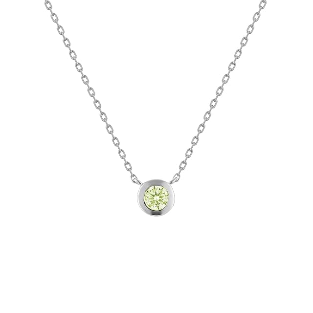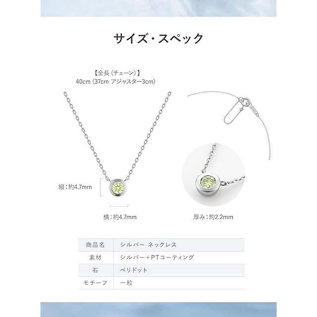 8月の誕生石、ペリドットを『ベゼルセッティング』で留めたシンプルな一粒ネックレス。爪のないすっきりとしたデザインが特徴の『ベゼルセッティング』は、石をひとまわり大きく見せてくれる効果があります。プラチナコーティングの洗練された輝きが肌に映え、胸元を演出してくれます。ベーシックでオンオフ問わずお使いいただけるデザインは大切な方へのプレゼントにおすすめです。※天然石・天然素材を使用しているため、実際の色味や風合いが異なる場合がございます。