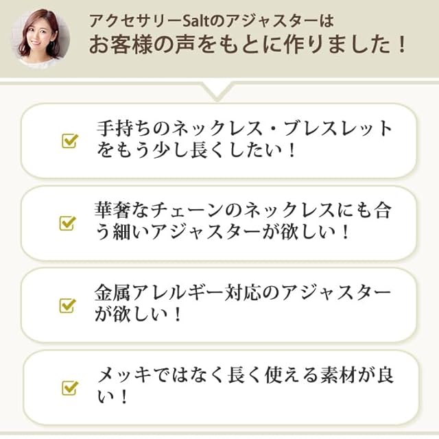 華奢で細いチェーン(チェーン幅約1.15mm)を使用しているのでお手持ちの華奢なネックレス(ベネチアンチェーンなど)のデザインを邪魔することなくチェーンの長さを延長することができます。