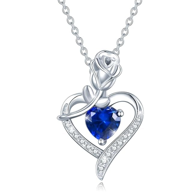 【彼女や奥様にロマンチックなローズ】大粒のサファイアをオープンハートに、そして、繊細に細かく研磨されて美しい薔薇を飾り付けている誕生石ネックレス。皆さんご存知の薔薇。 愛と美の象徴として花の中で一番好き!という人も多いでは。誕生日や特別な日などのお祝いをジュエリーに入れて相手にちゃんと伝え、二人の絆を深めることになるのでしょう。