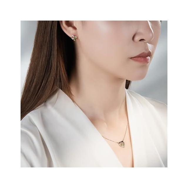 ペリドットのやさしい輝き:ハート型のネックレスとピアスには、澄んだペリドットがやさしく輝きます。希望と安らぎを象徴するこの石は、太陽の光を宿したような黄緑色で、身につけるたびに心が明るくなるような上品な輝きを放ちます