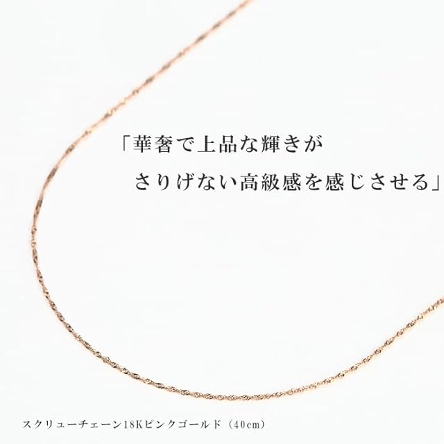 【こんなシーンに】プレゼント(お誕生日・記念日・バレンタイン・ホワイトデー・母の日・クリスマス・結婚や出産のギフト等)にも、セレモニー(卒業式・入学式等)やパーティーのコーディネートにも。特に男性から女性へ、彼女や奥様への贈り物におすすめ。定番のk18スクリューチェーンは単品でシンプルに使用しても、お手持ちのペンダントの替えのチェーンとしても活躍します。